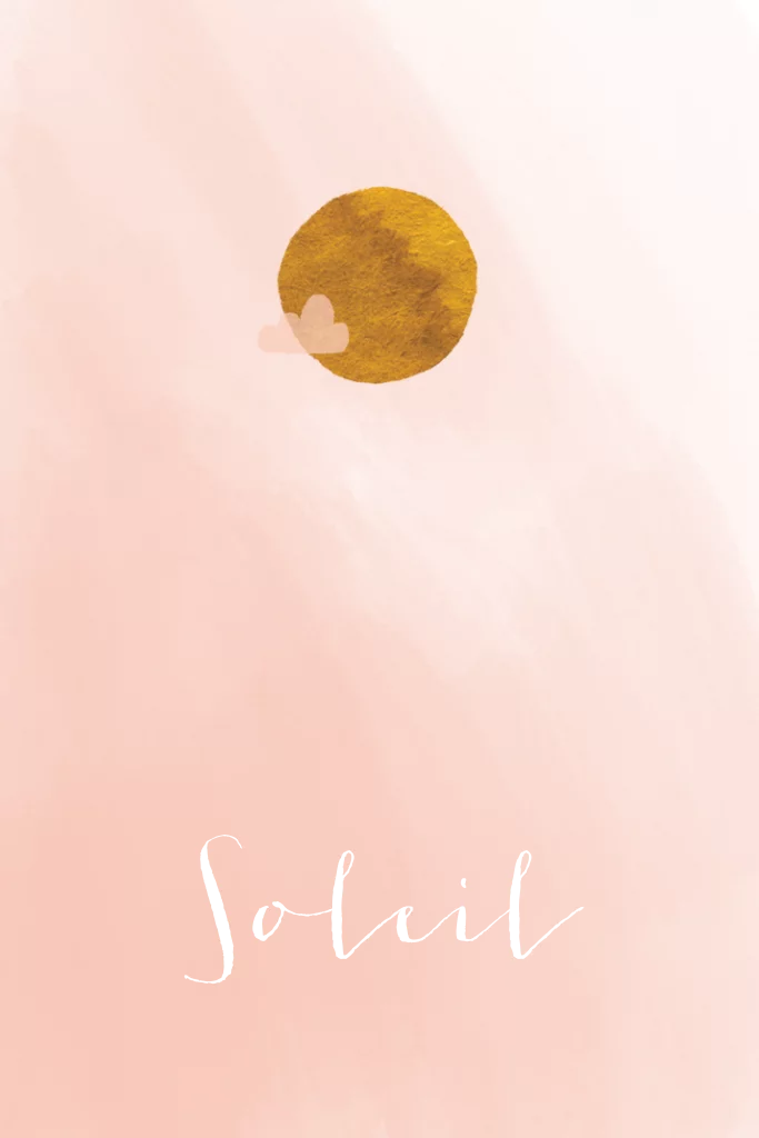 Een geboortekaartje met een watercolour zon op een watercolour achtergrond, met goudfolie.