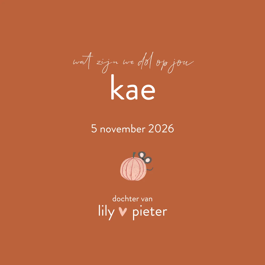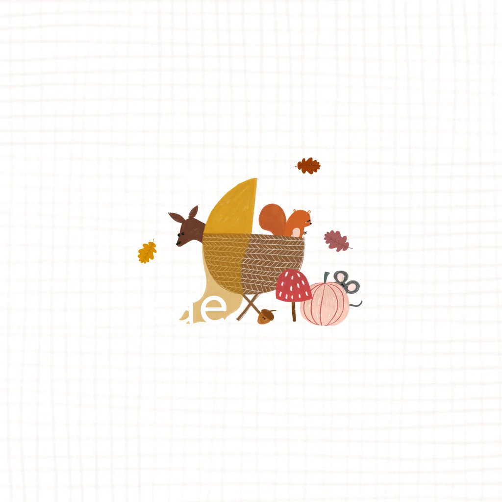 Een minimalistisch lief geboortekaartje in herfst stijl met een illustratie van een wiegje met allerlei bosdieren er omheen. Kies een ander kleur wiegje uit de beeldbank en vul het kaartje naar wens aan met andere herfst elementjes.