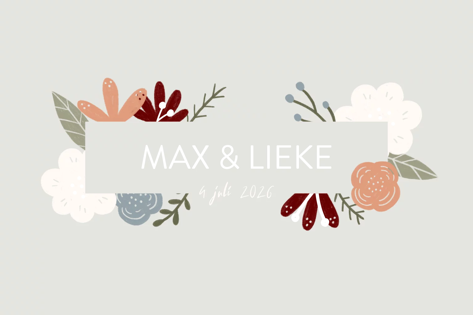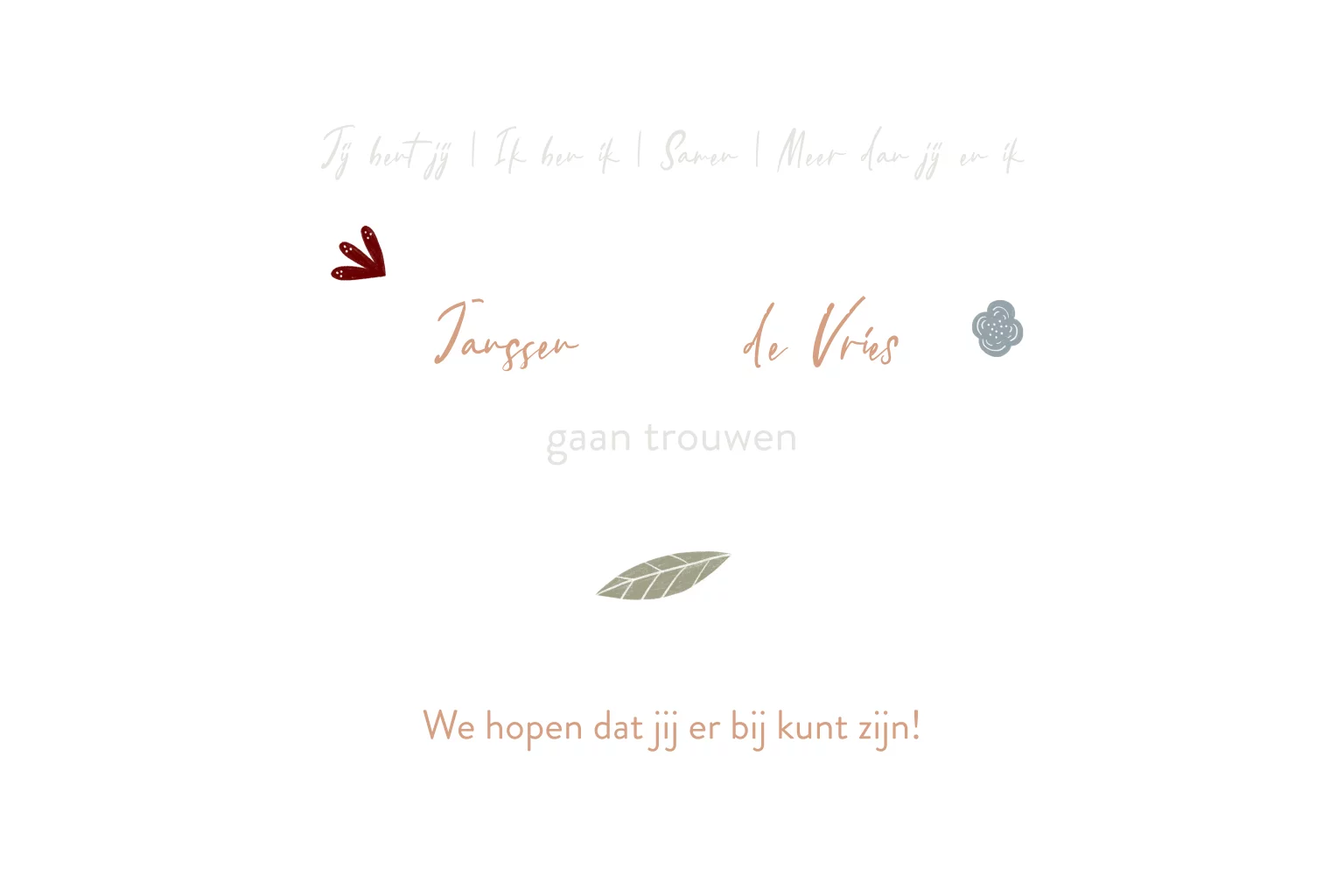 Een romantische lieve trouwkaart die je volledig naar wens kunt aanpassen. Kies de kleuren die passen bij jou bruiloft, pas de lettertypes aan en ga lekker knutselen totdat het jullie perfecte kaart is!