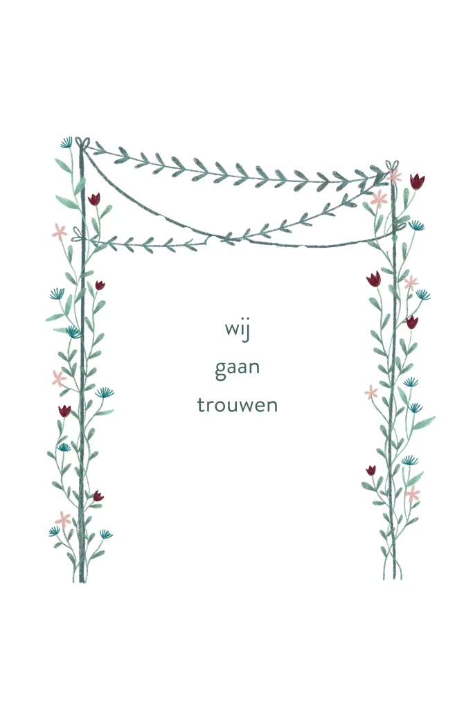 Een feestelijke trouwkaart met een boog vol planten en bloemen. De goudfolie lampjes maken dit kaartje tot een feestje!