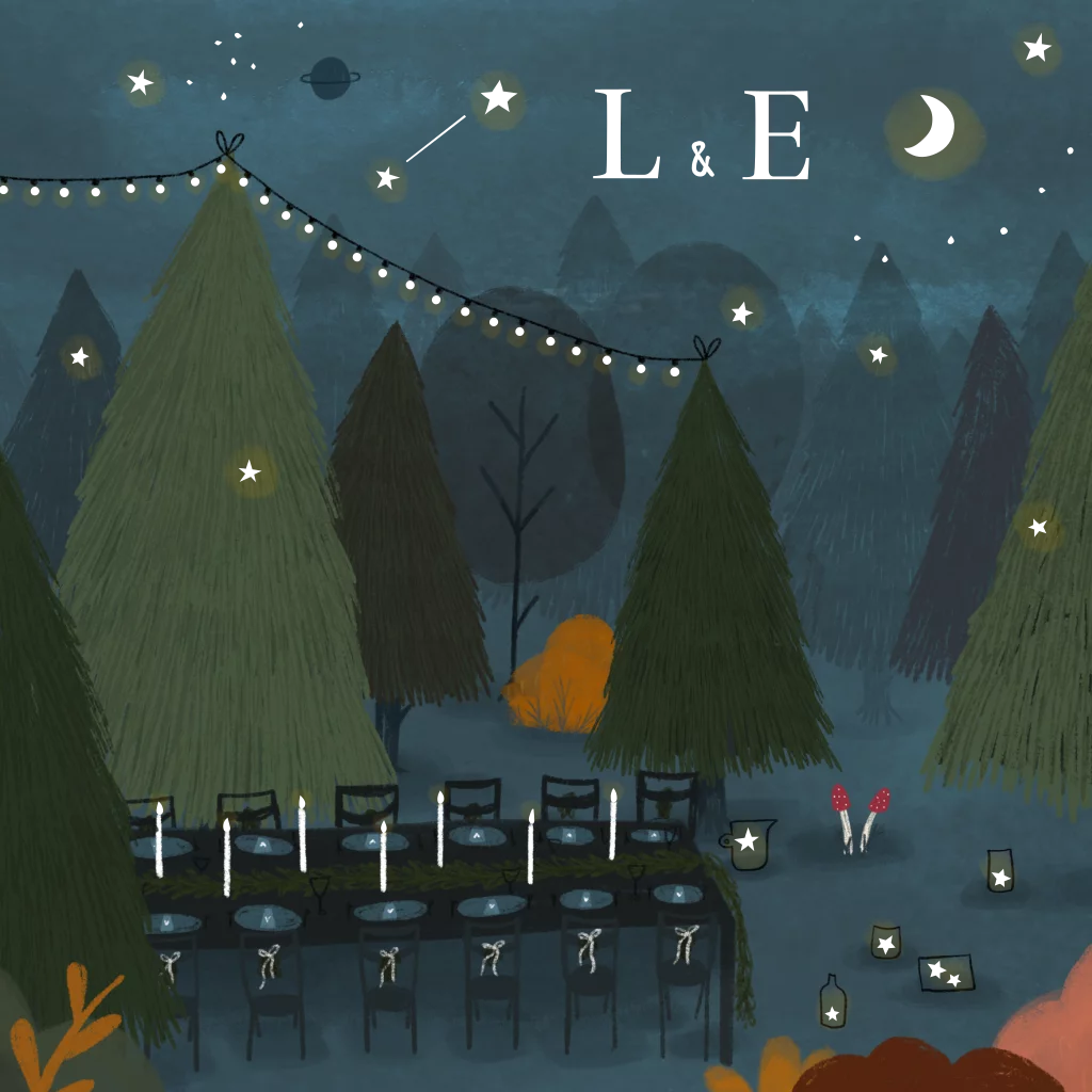 Een unieke dromerige trouwkaart met een romantisch diner onder de sterrenhemel in het bos, met glinsterende lightbulbs en kaarsjes.