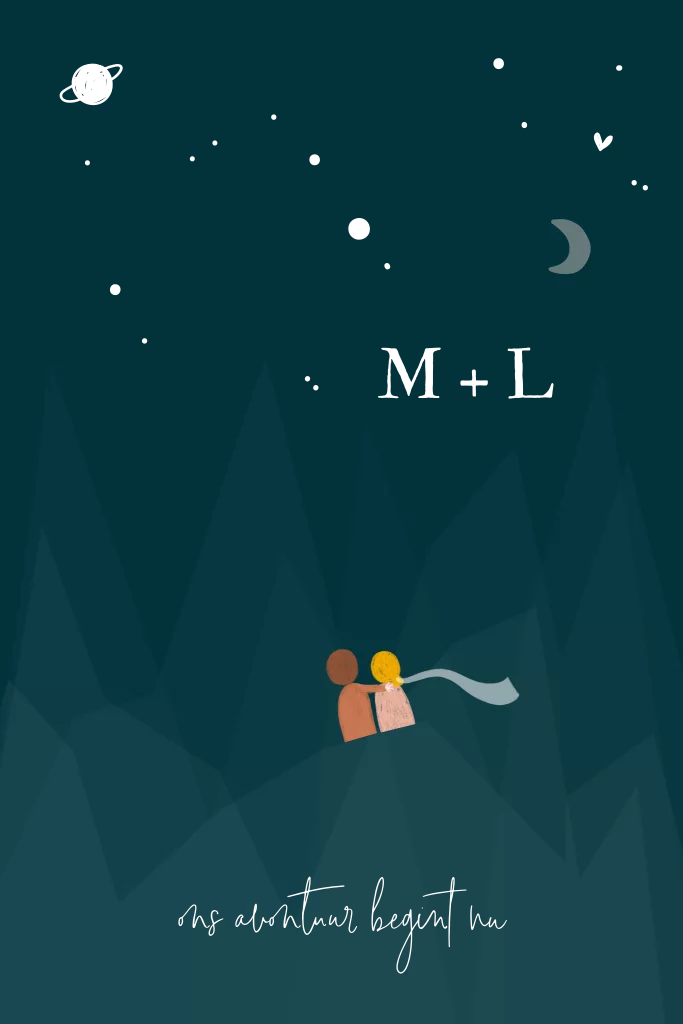Een geillustreerde trouwkaart met een illustratie van een bruidspaar die naar de sterren van goudfolie kijkt samen. Je kunt alle kleuren naar wens wijzigen!