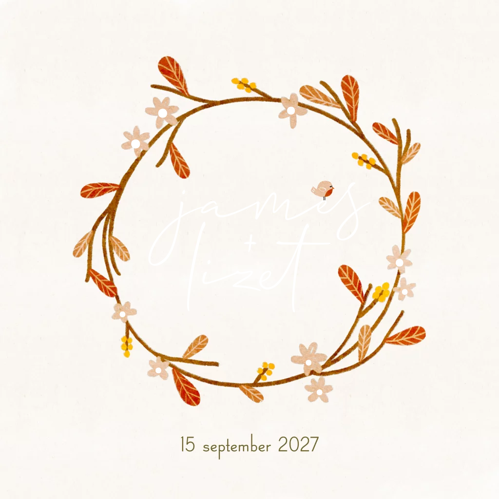 Deze trouwkaart is perfect voor bruidsparen die gaan trouwen in de nazomer of in de herfst. Met mooie warme diepe kleuren, die prachtig passen bij roségoudfolie. Een vrolijke krans met blaadjes en bloemen met daarin de namen en een schattig vogeltje.