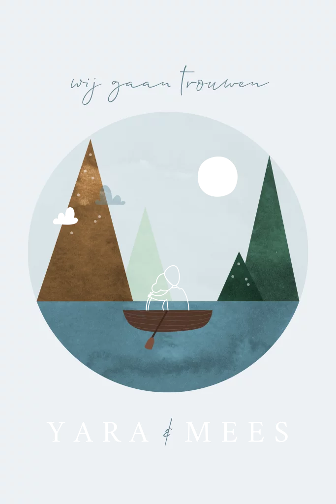 Een rustige avontuurlijke trouwkaart met waterverf illustratie van bergen, een meer, een bootje met een bruidspaar erin van goudfolie. Pas zelf het kaartje naar wens aan. Het kaartje is extra speciaal met ronde hoeken.