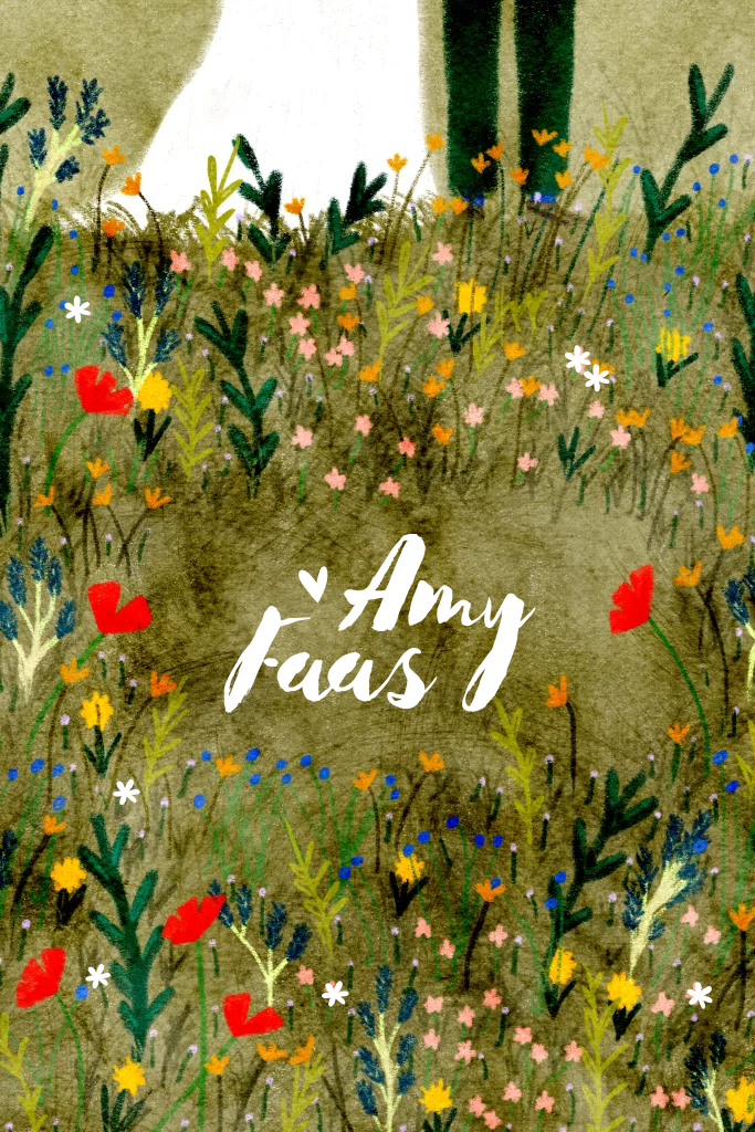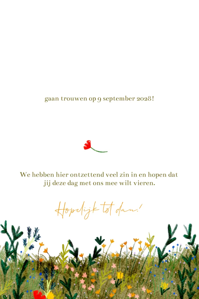 Een bijzondere geïllustreerde trouwkaart met een illustratie van een bruidspaar die staat in een zomerse bloemenweide, vol veldbloemen zoals een klaproos.