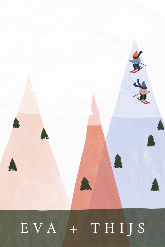 Een unieke geillustreerde trouwkaart met een illustratie van skiërs, die van vrolijk gekleurde bergen af skiën. Pas de kaart volledig naar wens aan. Wil je de skiërs in een andere kleur? Neem even contact op!