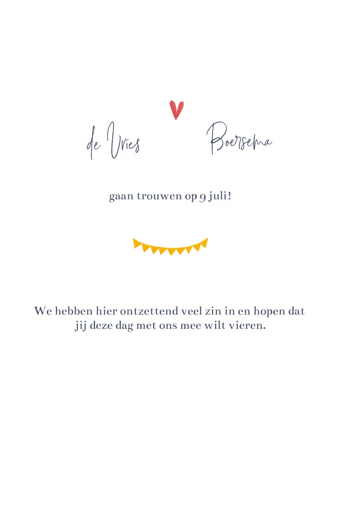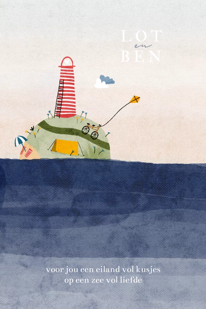 Een bijzondere geïllustreerde waterverf trouwkaart met een zee en een eiland waar een schattige vuurtoren (met goudfolie hartje!), tandemfiets met vlieger, strand met parasol en tentje op staat. Voor echte avonturiers en levensgenieters!