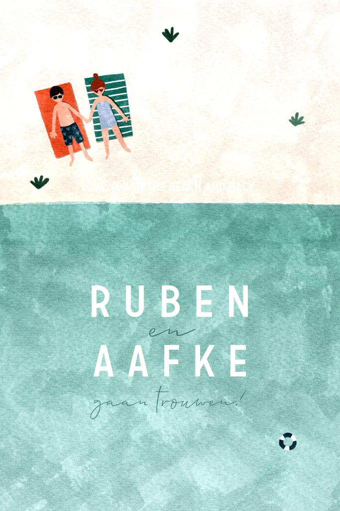 Een bijzondere geïllustreerde waterverf trouwkaart met een portret van een koppel wat in ligt te zonnen op het strand op strandlakentjes. Perfect voor echte zon en strand liefhebbers of een strandbruiloft! Bewerk het kaartje naar wens (huids en haarkleur kun je eenvoudig zelf aanpassen door het aan te klikken, wil je het kapsel/geslacht wijzigen? Stuur dan even een berichtje! We helpen je graag).