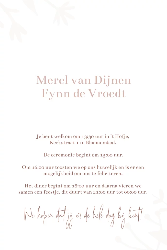 Een typografische trouwkaart met hippe terrakleur en goudfolie bloemen. Je kunt alles naar wens aanpassen. Aan de binnenkant is ruimte voor een mooie foto!
