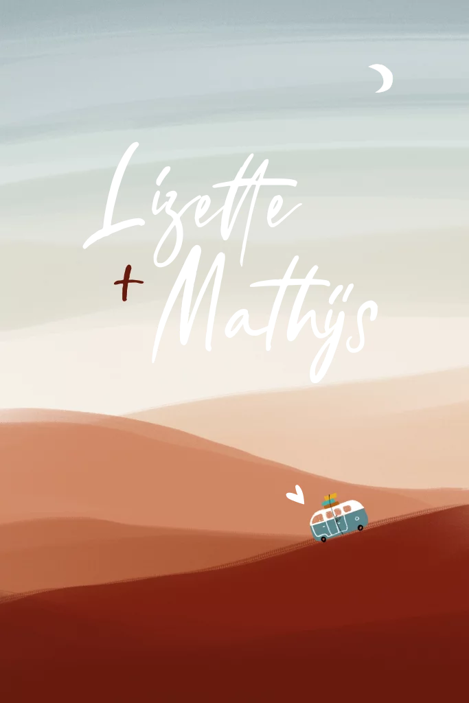 Een minimalistische avontuurlijke trouwkaart met een waterverf landschap en een volkswagenbusje. Het kaartje is helemaal af met rosegoudfolie, kies zelf je foliekleur.