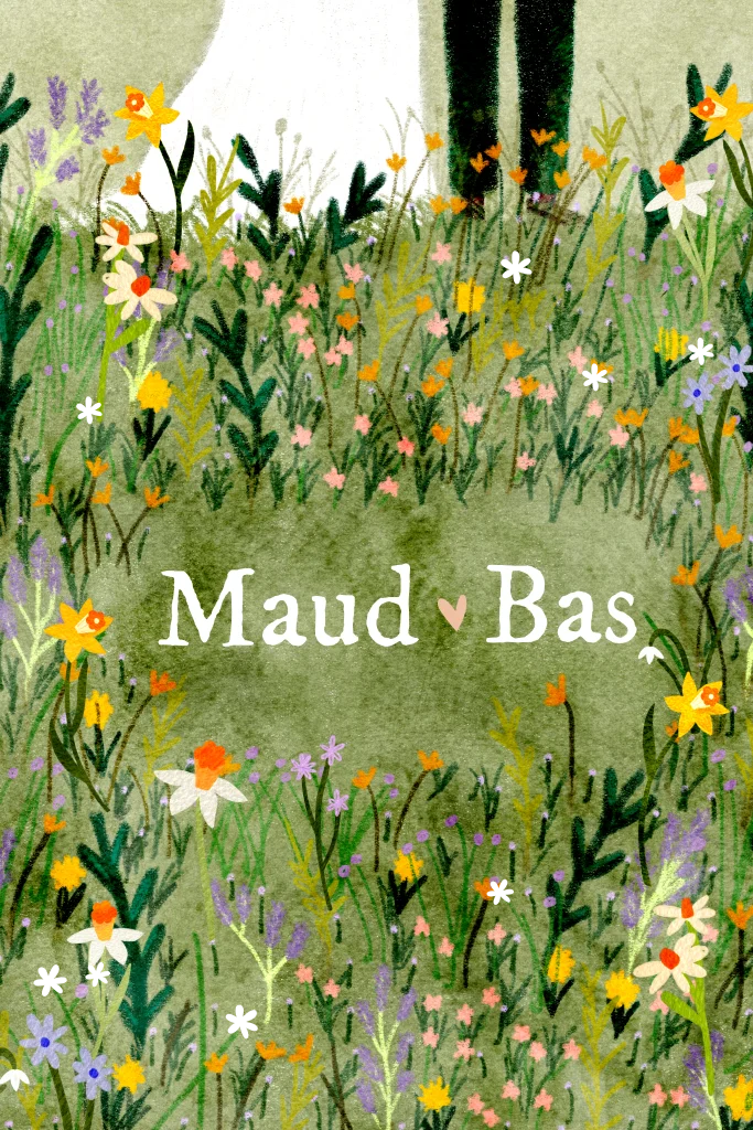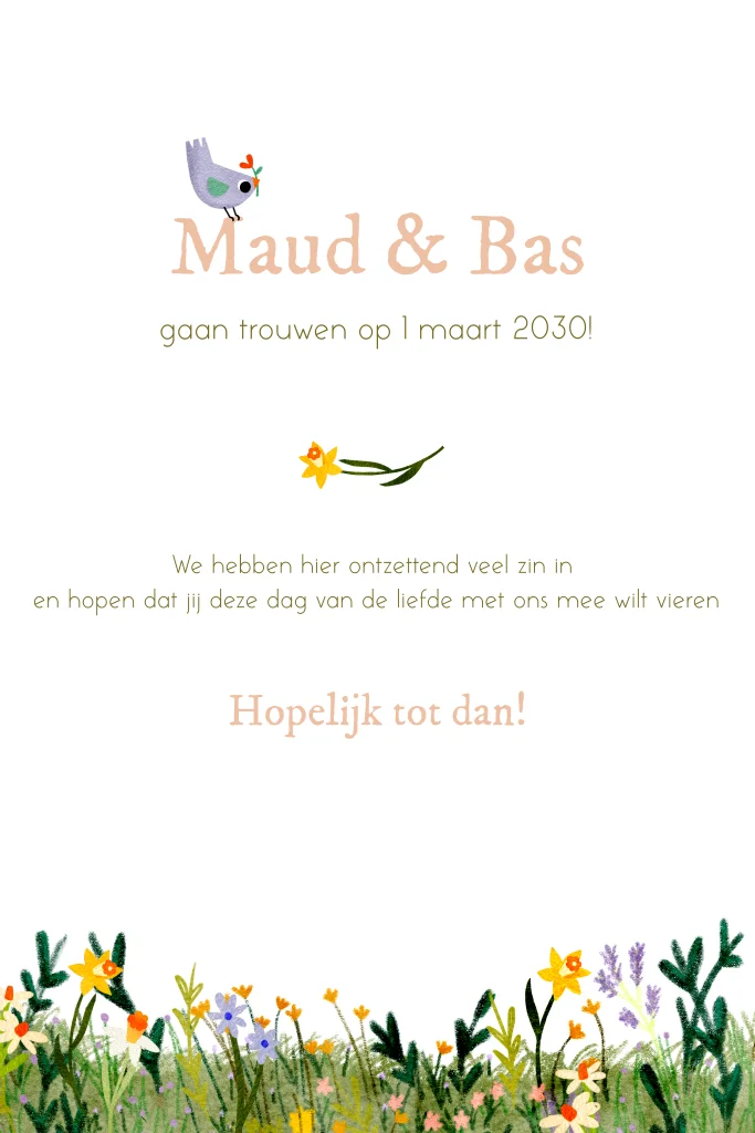 Verras je gasten met deze sfeervolle trouwkaart vol wildbloemen en lentebloemen zoals narcissen! Met een lieve illustratie van een bloemenweide in pastelkleur en het bruidspaar subtiel in beeld is dit de perfecte kaart voor een romantische buitenbruiloft in de lente.