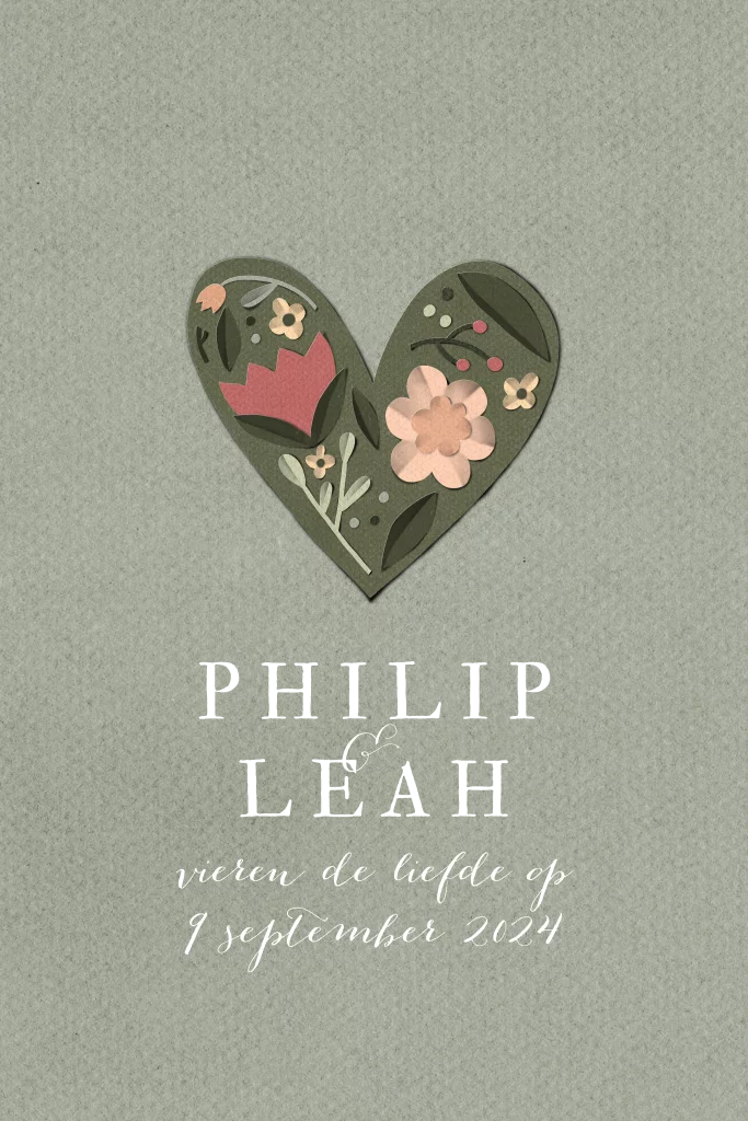Een unieke trouwkaart met een papierillustratie, met een hart vol met bloemen en plantjes.