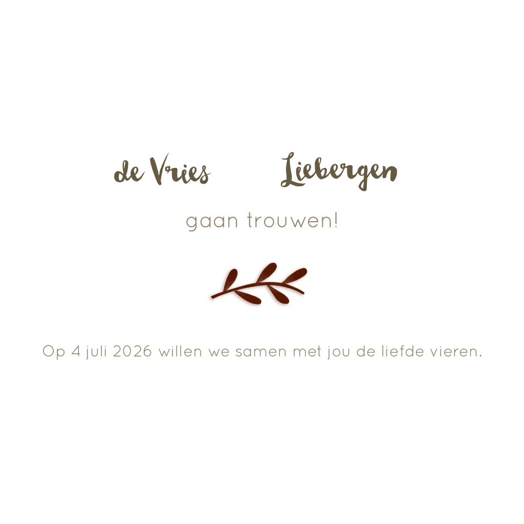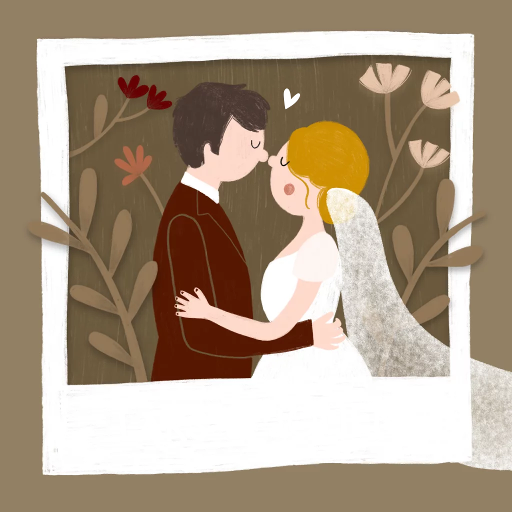 Een bijzondere trouwkaart met een portret in een polaroid. Pas zelf alle kleuren aan door een elementje aan de klikken en in het kleurenpalet een kleur aan te vinken. Klik op het +-tekentje voor nog meer kleuren. Liever een ander kapsel of wil je het geslacht aanpassen? Mail dan even, dan pas ik het voor je aan!