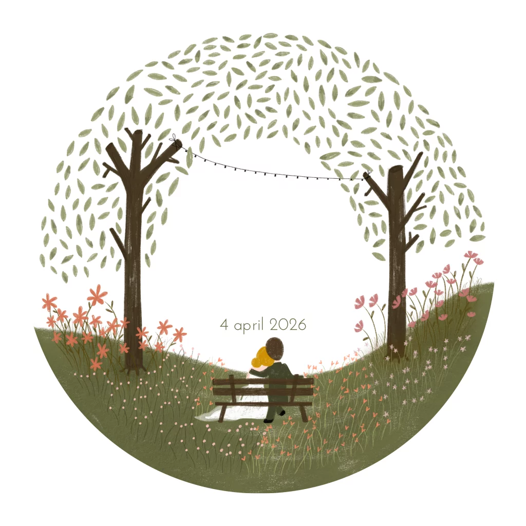 Een geïllustreerde romantische trouwkaart met een bruidspaar tussen de bloemen. De goudfolie op de kaart maakt het extra chique! Pas de kleur aan van alle bloemetjes en het bruidspaar naar wens door op het elementje te klikken en daarna naar het kleurenpalletje te gaan.