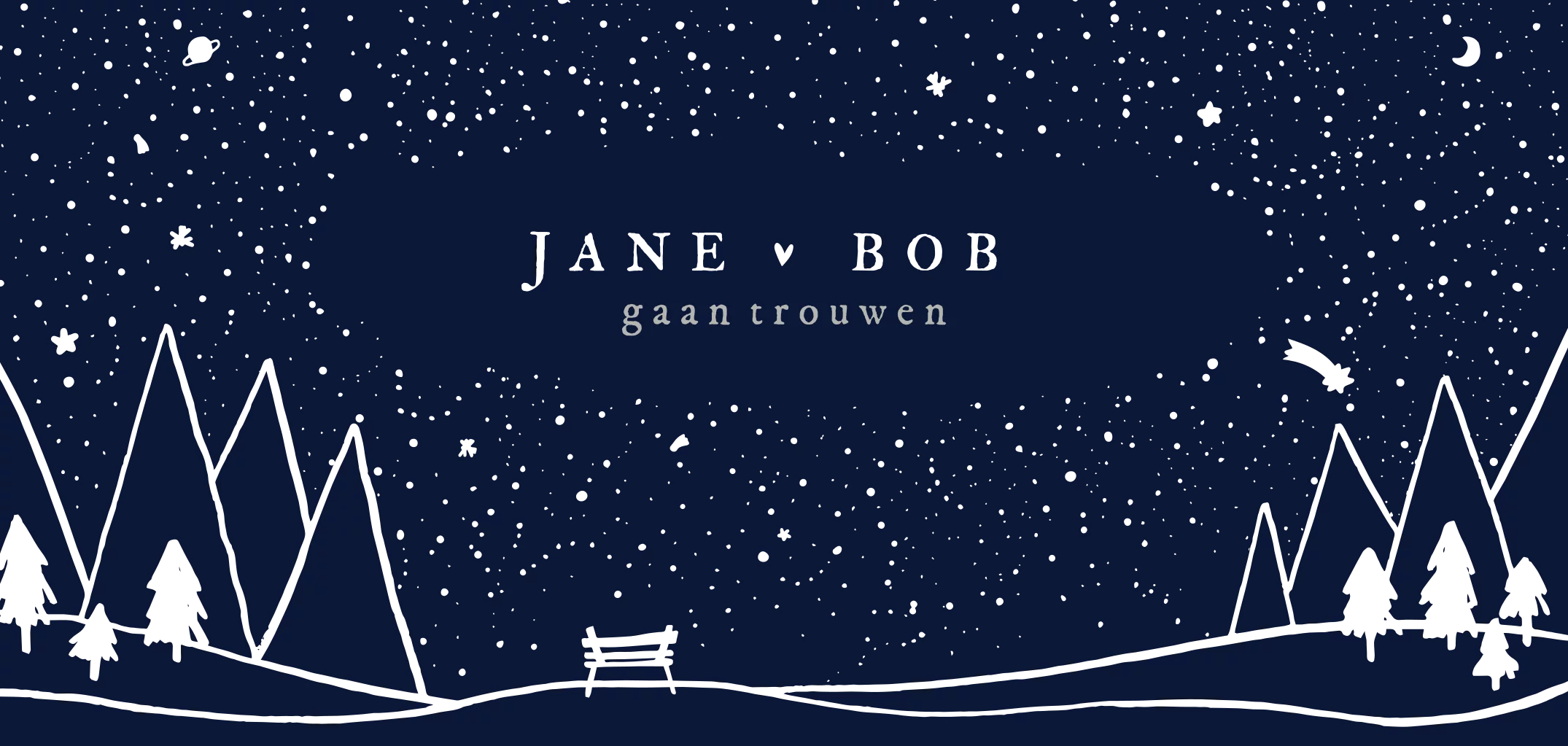 Een romantische trouwkaart met een illustratie van een sterrenhemel, een bankje in de natuur met bergen en bomen. Het zilverfolie maakt er een magische kaart van!