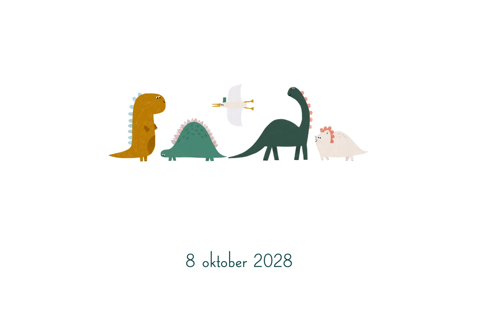 Een vrolijk, lief en avontuurlijk rustig geboortekaartje met een parade van schattige dino's en hippe holografische folie sterren en maantje.
