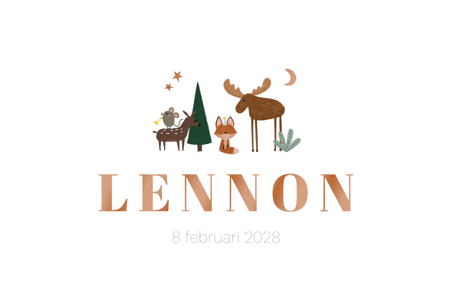 Een vrolijk, lief en rustig geboortekaartje met bosdieren rondom de naam van je kindje die in hoogglans staat. Kies zelf de kleur van de hoogglans folie!