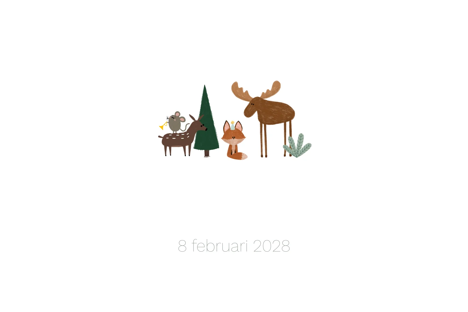 Een vrolijk, lief en rustig geboortekaartje met bosdieren rondom de naam van je kindje die in koperfolie staat. Kies zelf de kleur van de folie!