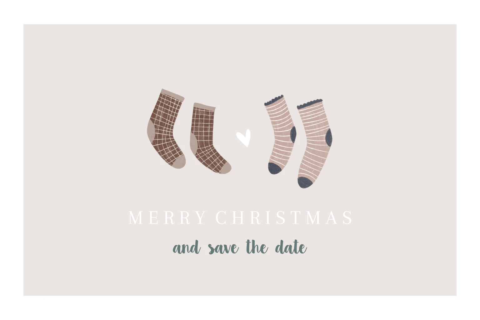 Een lieve en moderne save the date kerstkaart met twee paar gezellige wintersokken en een subtiel hartje ertussen. De zachte tinten en minimalistische stijl maken dit kaartje perfect voor koppels die hun trouwdatum op een speelse, stijlvolle manier willen aankondigen tijdens de kerst.