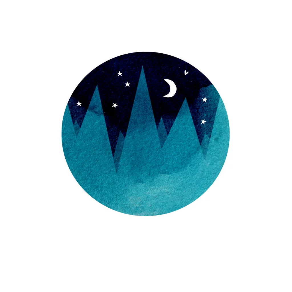 Een minimalistisch dromerig kaartje met bergen in de vorm van een wereldbol van waterverf. Afgemaakt met een lieve maan en sterretjes in goudfolie.