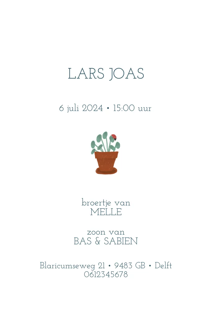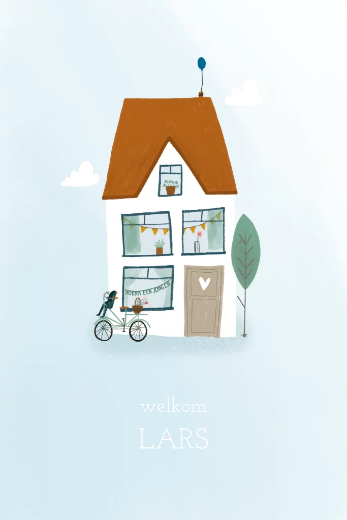 Een knus huiselijk geboortekaartje voor een jongen. Je kunt zelf de achtergrond en de schaduw onder het huisje een andere kleur geven, zo maak je het kaartje helemaal naar jullie wensen!