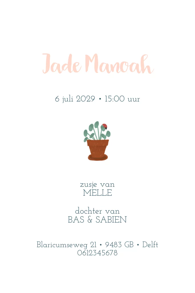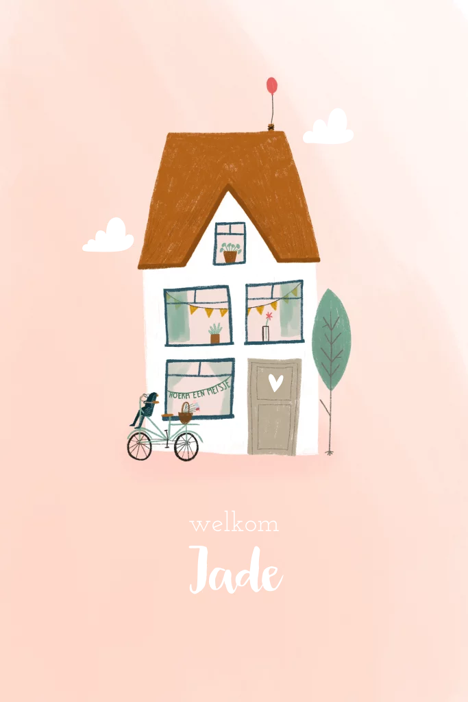 Een knus huiselijk geboortekaartje voor een meisje. Je kunt zelf de achtergrond en de schaduw onder het huisje een andere kleur geven, zo maak je het kaartje helemaal naar jullie wensen!