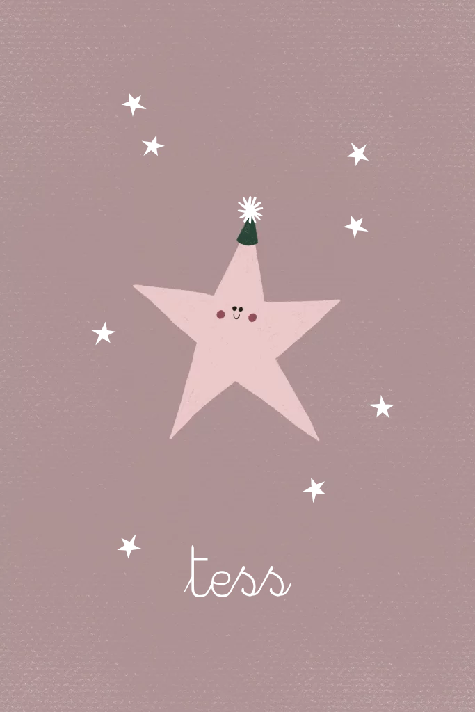 Een feestelijk kaartje met een lieve ster met een feesthoedje. De glanzende sterretjes maken het extra feestelijk op de oudroze achtergrond.