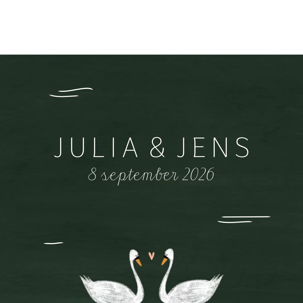 Een minimalistische Save the date die past bij de trouwkaart Trouwkaart goudfolie vijver bloemen zwaan donkergroen