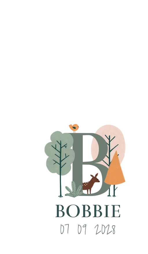 Een vrolijke schattige geboortevlag met de initiaal van de naam van jouw kindje en illustraties van bomen en een hertje. Deze vlag is ook heel leuk om op te blijven hangen als je kind jarig is bijvoorbeeld. Zo blijft het een mooi terugkomend iets elk jaar! (Tip: verwijder dan de geboortedatum of het geboortejaar). Deze grote geboortevlag is 60 x 60 x 120.