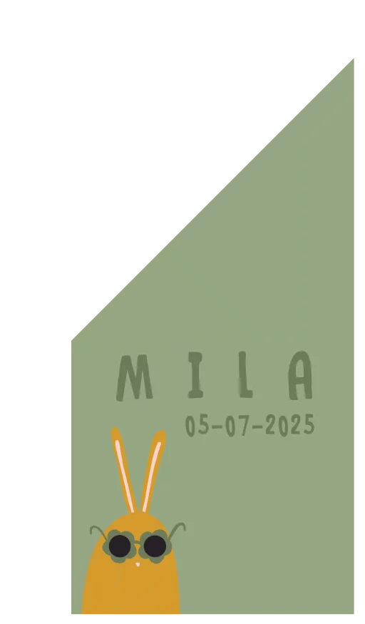 Een schattige geboortevlag met illustratie van een lief konijntje met hippe bloemenzonnebril. Pas de kleuren zelf naar wens aan. Deze vlag is ook heel leuk om op te blijven hangen als je dochter jarig is bijvoorbeeld (haal dan de geboortedatum/het jaartal er vanaf). Zo blijft het een mooi terugkomend iets elk jaar! Deze grote geboortevlag is 60 x 60 x 120.
