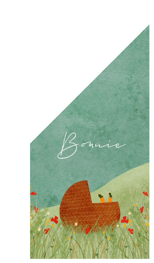 Een mooie geboortevlag met een illustratie van een landschap met weilanden, duinen, zee en wildbloemen.