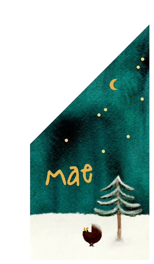 Een mooie geboortevlag met een winterse illustratie van het Noorderlicht op de achtergrond, goudgele sterren, een maan en een lief wiegje onder een boom.