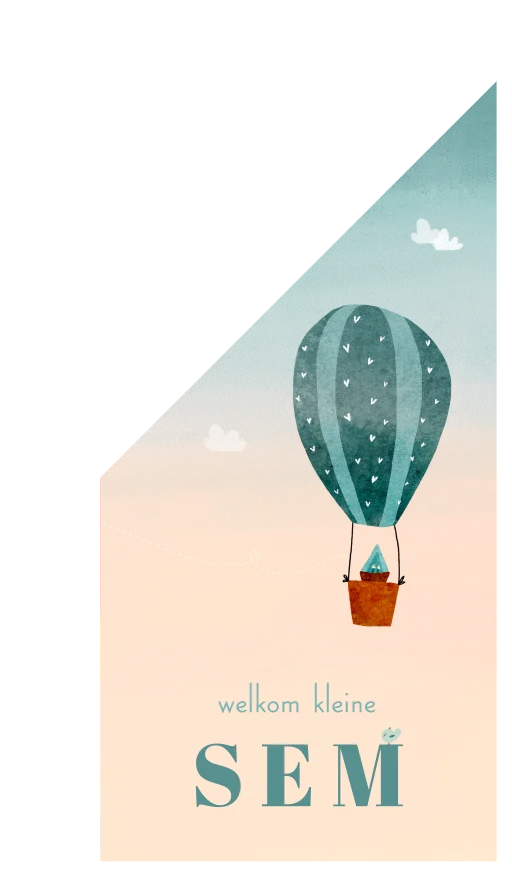 Een mooie geboortevlag met waterverf illustratie van een luchtballon met een wiegje erin. Op de achtergrond een prachtige waterverf achtergrond van een lucht vol kleuren van de zonsondergang.