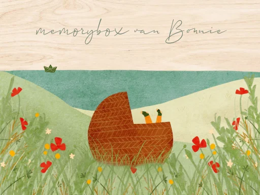 Een memorybox om alle herinneringen van de zwangerschap en/of babytijd te bewaren. Op de deksel zie je een illustratie van een landschap met weilanden, duinen, zee en wildbloemen.