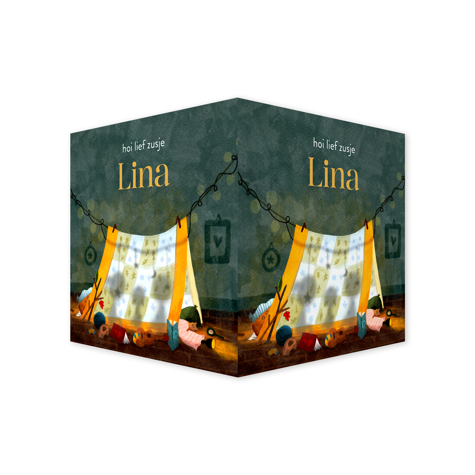 Dubbel vierkant raambord met een dromerige illustratie van een broer en zus die met hun baby broertje of zusje een hut van dekens hebben gebouwd. Daaromheen allerlei spulletjes uit een kinderkamer.