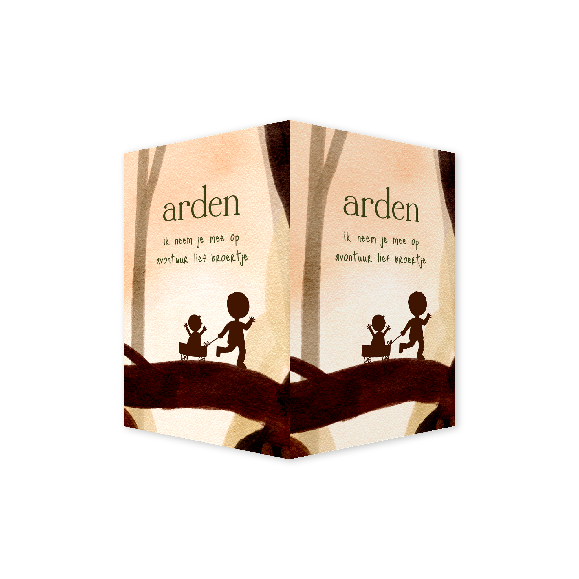 Maak de geboorte van je kindje bekend met dit herfstige geboortebord. Het bord heeft een illustratie van een bos met herfst blaadjes en een silhouette van twee kindjes op avontuur.