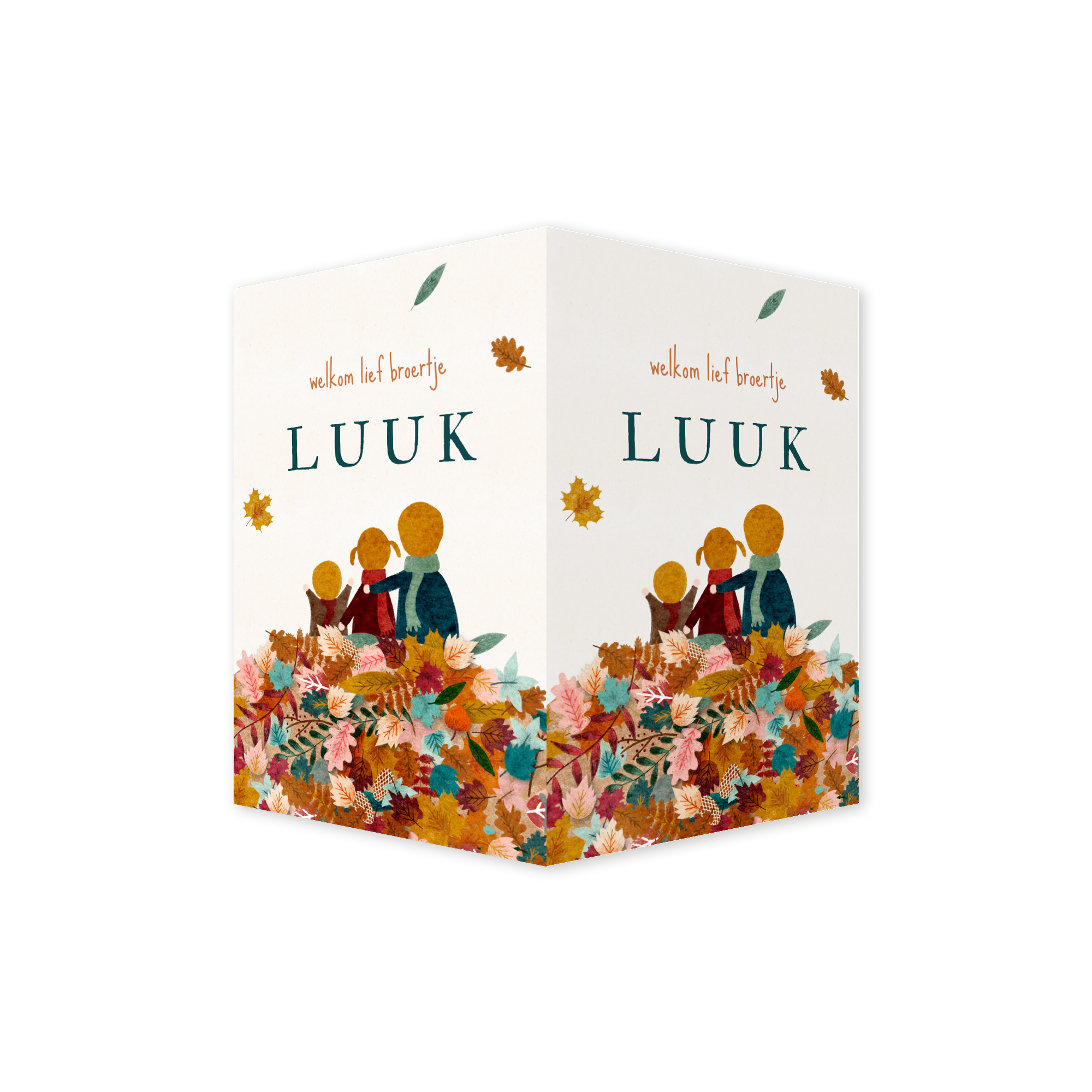Dubbel staand raambord met een grote broer en zus, geschikt voor een tweede kindje of een derde kindje. Het kaartje staat vol met vrolijke gekleurde herfstbladeren, paddenstoelen en pompoenen.