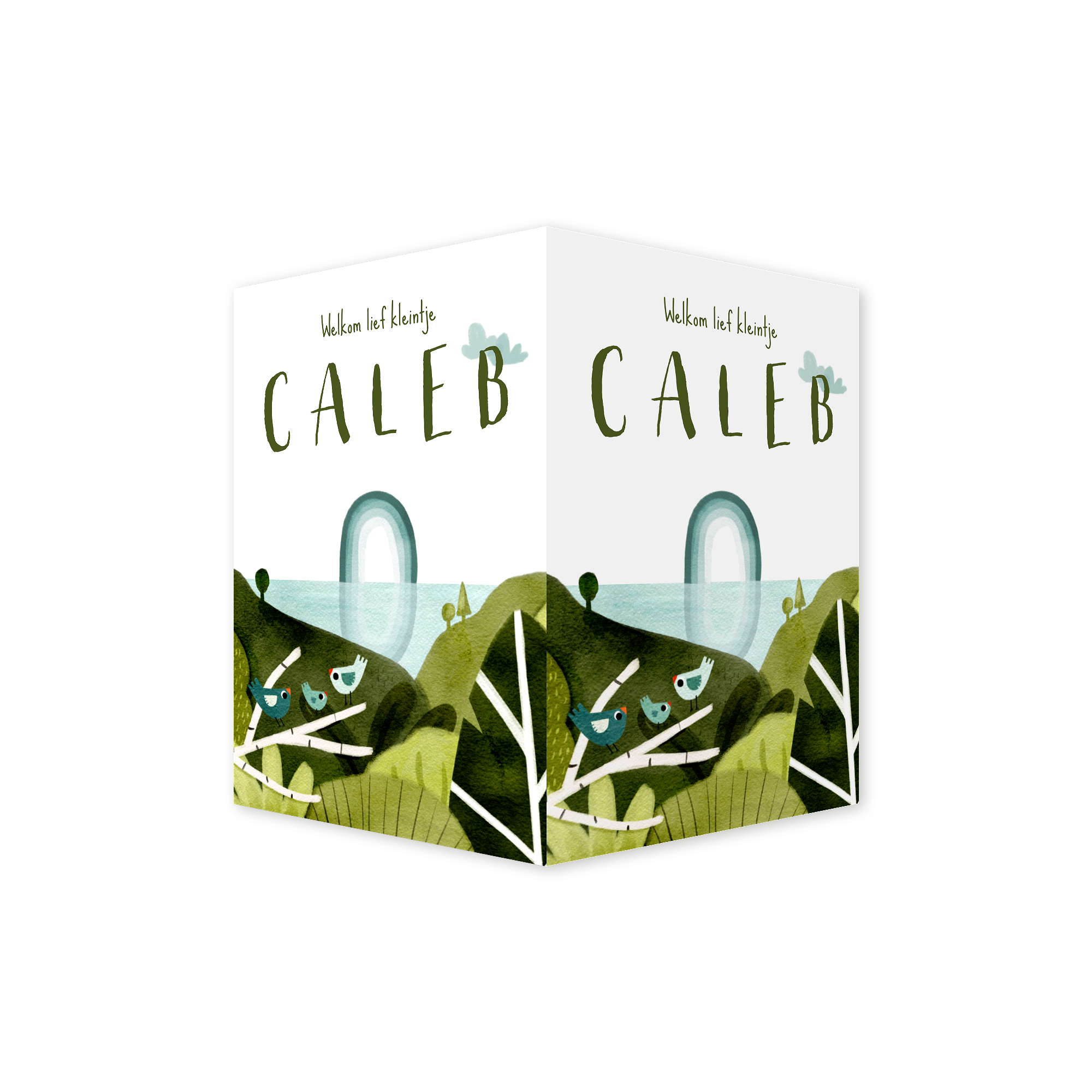 Maak de geboorte van je kindje bekend met dit vrolijke dubbele raambord (40 x 60 cm) met een illustratie van een landschap vol groene bomen, uitkijkend op de zee en met een mooie blauwe regenboog. Vooraan op de tak zit een lief klein vogel gezin.