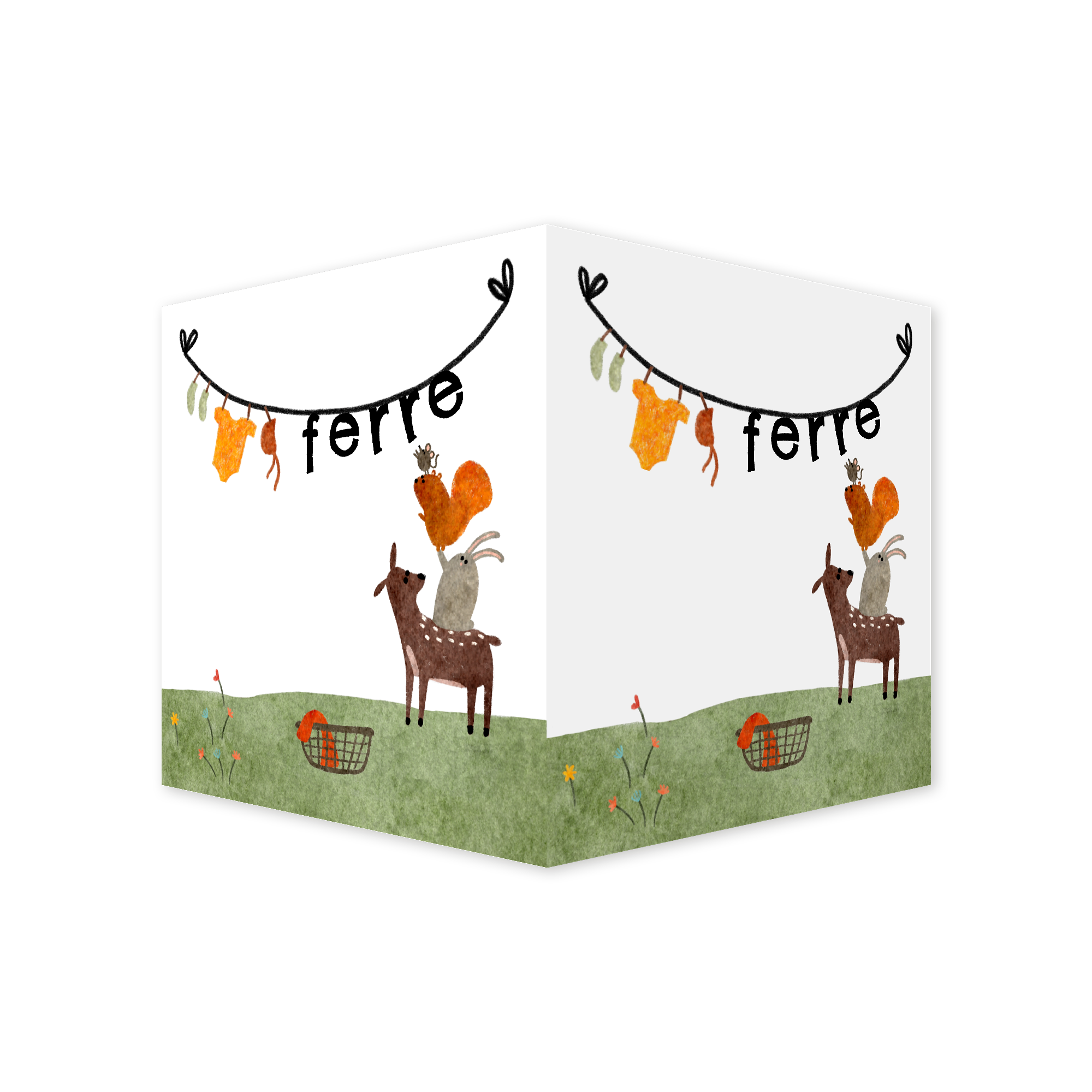Maak de geboorte van je kindje bekend met dit vrolijke dubbele raambord (50x50 cm) van een waslijntje met babykleertjes en de naam van je kindje. Een stapeltje bosdieren hangt alles op.