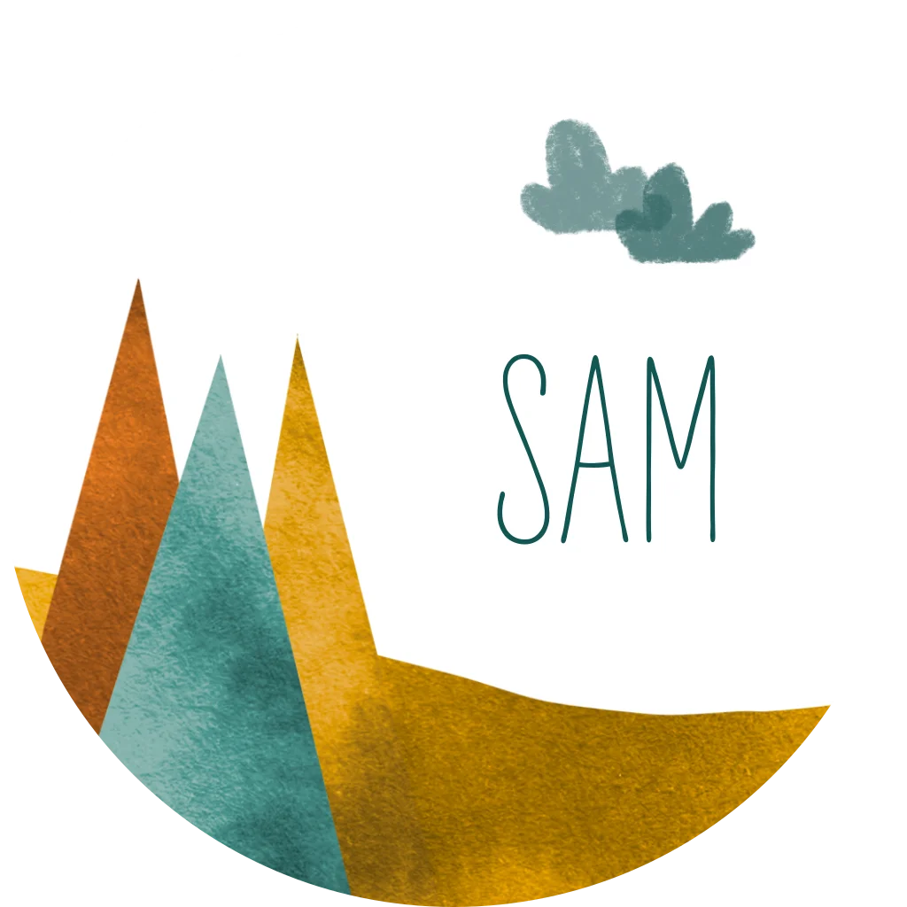 Leuke raamsticker (doorsnede 60 cm) met drie bergen in een goudkleurig landschap.