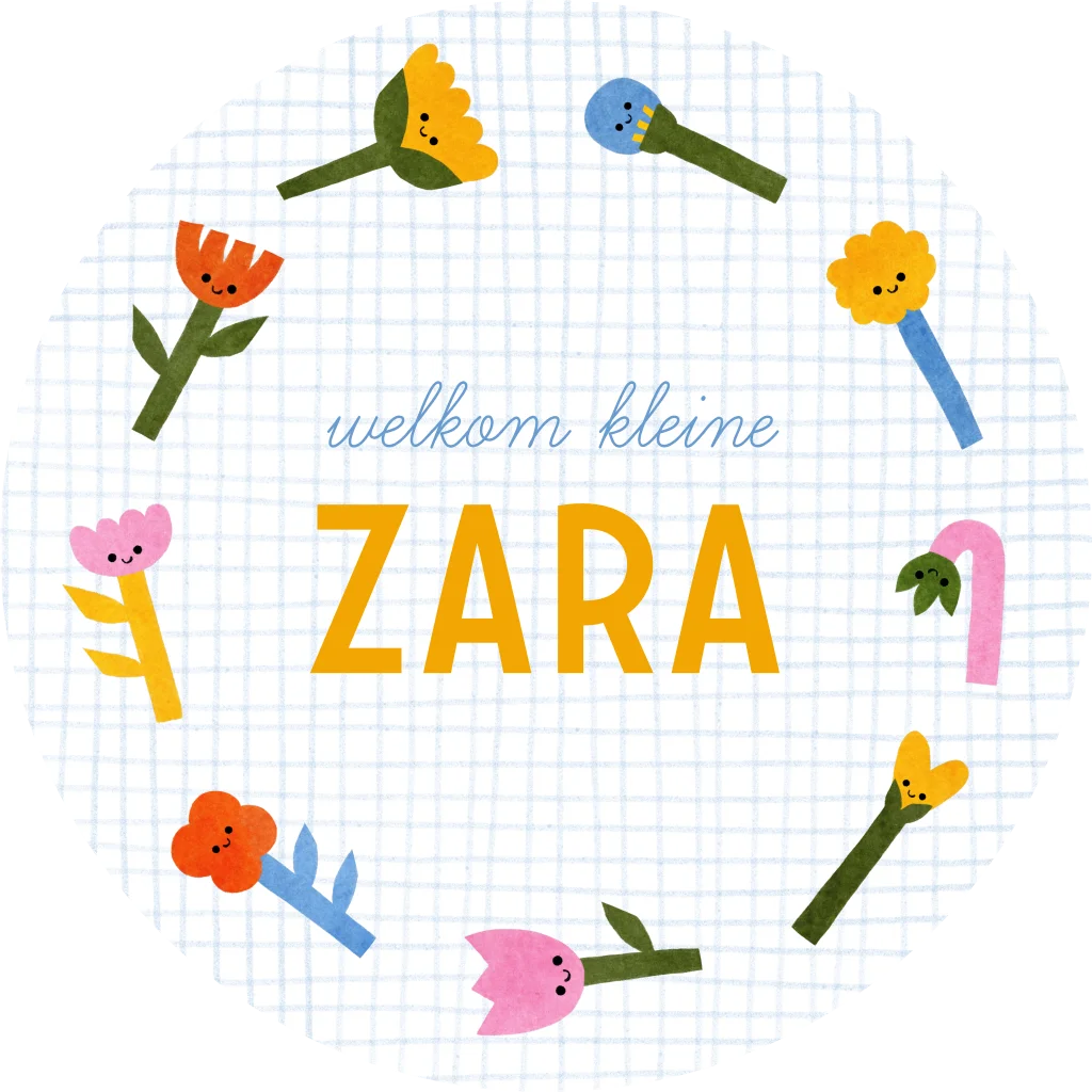Maak de geboorte van jullie kindje bekend met deze hippe raamsticker (doorsnede 60 cm) met vrolijke bloemen. De bloemetjes staan in een cirkeltje en vormen zo een leuke krans op een achtergrond van ruitjes.