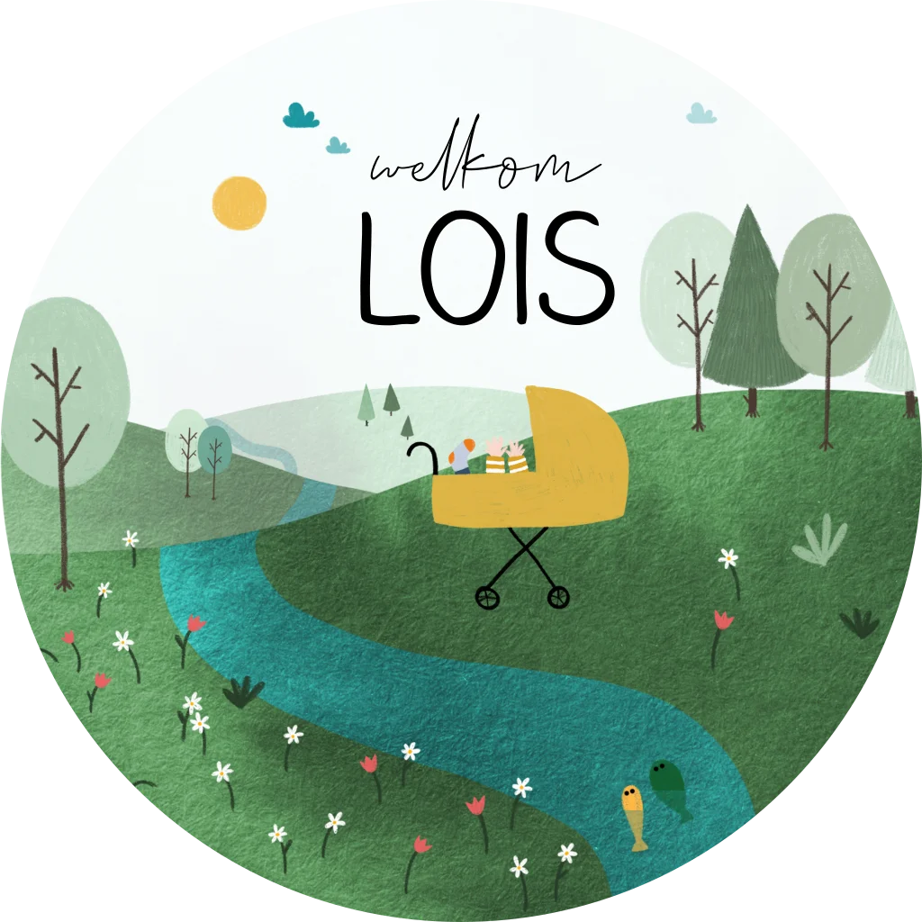 Maak de geboorte van jullie kindje bekend met deze leuke raamsticker (doorsnede 60 cm) met naam en waterverf illustratie van een landschapje met boompjes, rivier en kinderwagen. Bestel 'm vooraf of juist direct nadat de baby is geboren, met de datum erop. De raamsticker is op aanvraag ook beschikbaar in formaat 40 cm, 80 cm en 100 cm.
