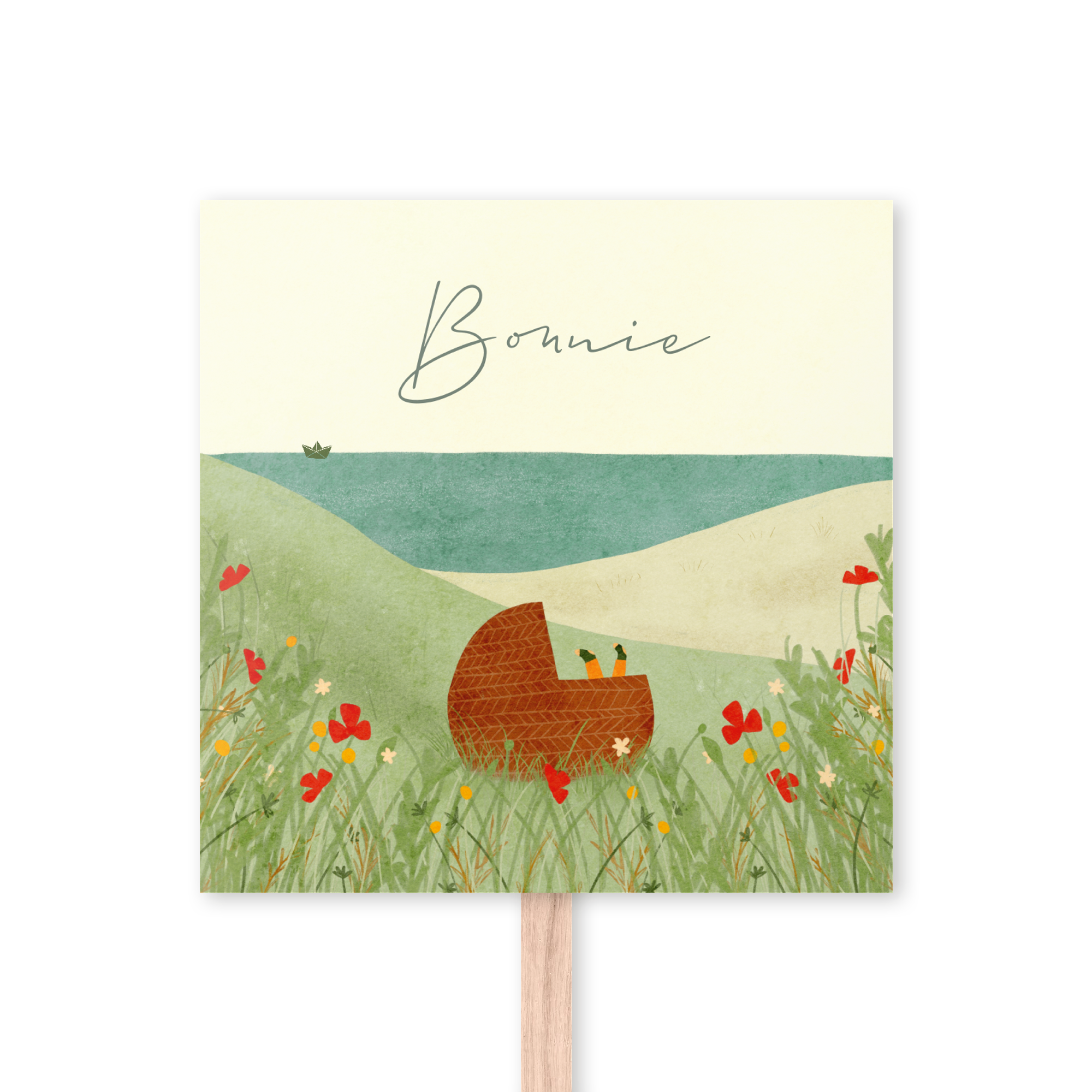 Kondig de geboorte van je kindje aan met dit leuke tuinbord met een illustratie van een landschap met weilanden, duinen, zee en wildbloemen.