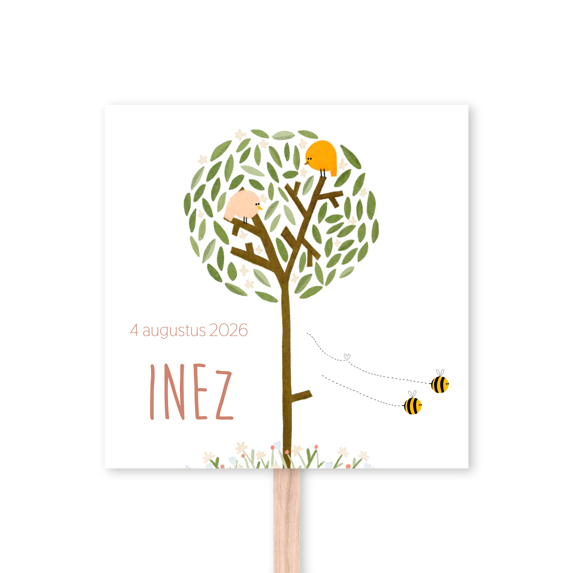 Kondig de geboorte van je kindje aan met dit leuke tuinbord. Het bord is voorzien van een vrolijke lente illustratie met een boom, vogeltjes en twee bijtjes.