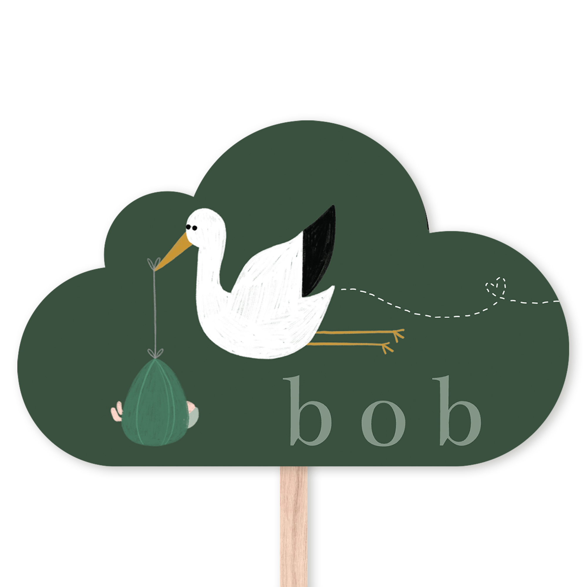 Kondig de geboorte van je kindje aan met dit mooie tuinbord in de originele vorm van een wolk. Dit bord heeft een mooie illustratie van een schattige ooievaar die een klein jongetje in een draagzakje komt brengen. Het bord is gemakkelijk aan te passen in de editor.