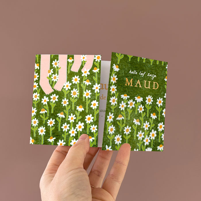 Een liggend luikvouw geboortekaartje met vrolijke illustratie van vier paar blote voetjes in het gras tussen de bloemetjes. Geinspireerd door het lieve geboorte gedichtje: blote voeten, wilde haren, ik wil avonturen sparen. De binnenkant laat genoeg ruimte vrij voor heel veel geboorte informatie. Een super leuk geboortekaartje voor jongens en meisjes!