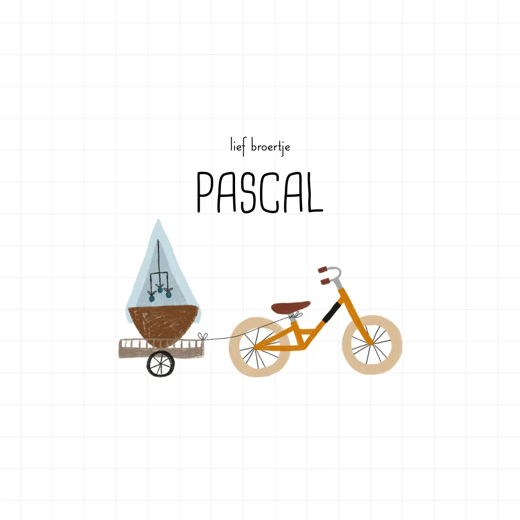 Een geboortekaartje voor een broertje met een loopfietsje en een karretje met een wiegje erin.