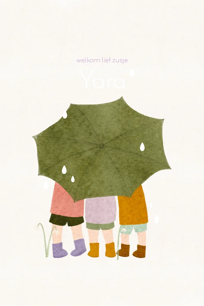 Een geboortekaartje voor een broertje of zusje met drie kindjes knus onder een paraplu in de lente of zomer, want laten we eerlijk zijn: er vallen dan ook veel druppels!