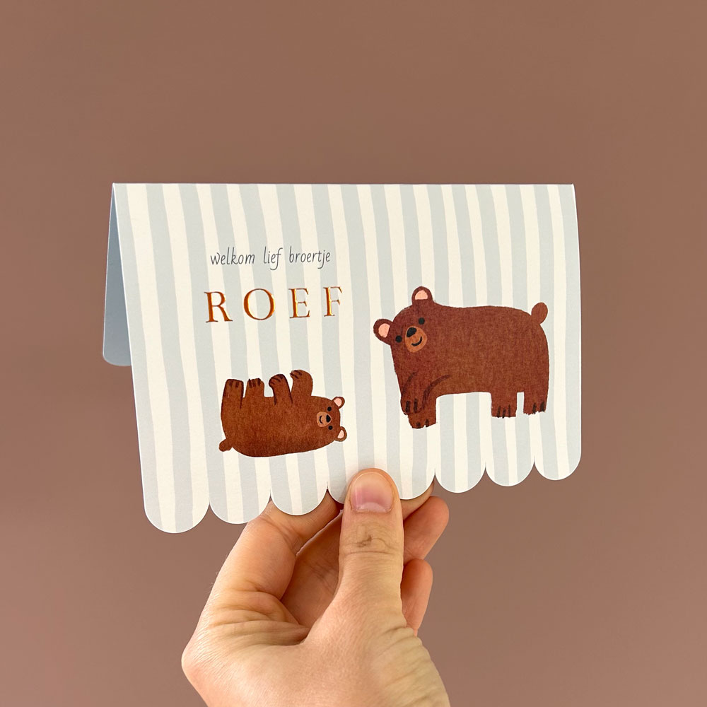 Een uniek geboortekaartje met een luifelvouw en golfrand aan de onderkant. Op de voorkant staan twee beertjes en een streepjesachtergrond, deze kun je in kleur nog helemaal aanpassen. In combinatie met de beertjes is dit een mooi klassiek neutraal kaartje voor jongens of meisjes, maar in een origineel nieuw jasje. Met plek voor grote broer of zus.