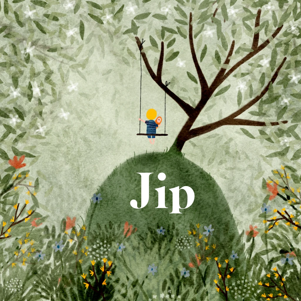 Een geïllustreerd geboortekaartje met vrolijk tafereel van een bos vol blaadjes en bloemen, met een schommel waar grote broer de baby vast houdt. Pas zelf de haarkleur van grote broer aan.